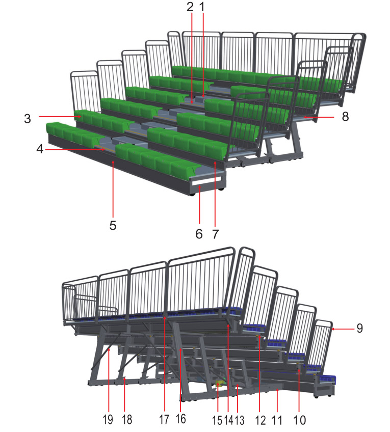 | 1.踏步 2.踏板 3.座椅 4.前沿板 5.前擋板 6.彈性首排支撐 |